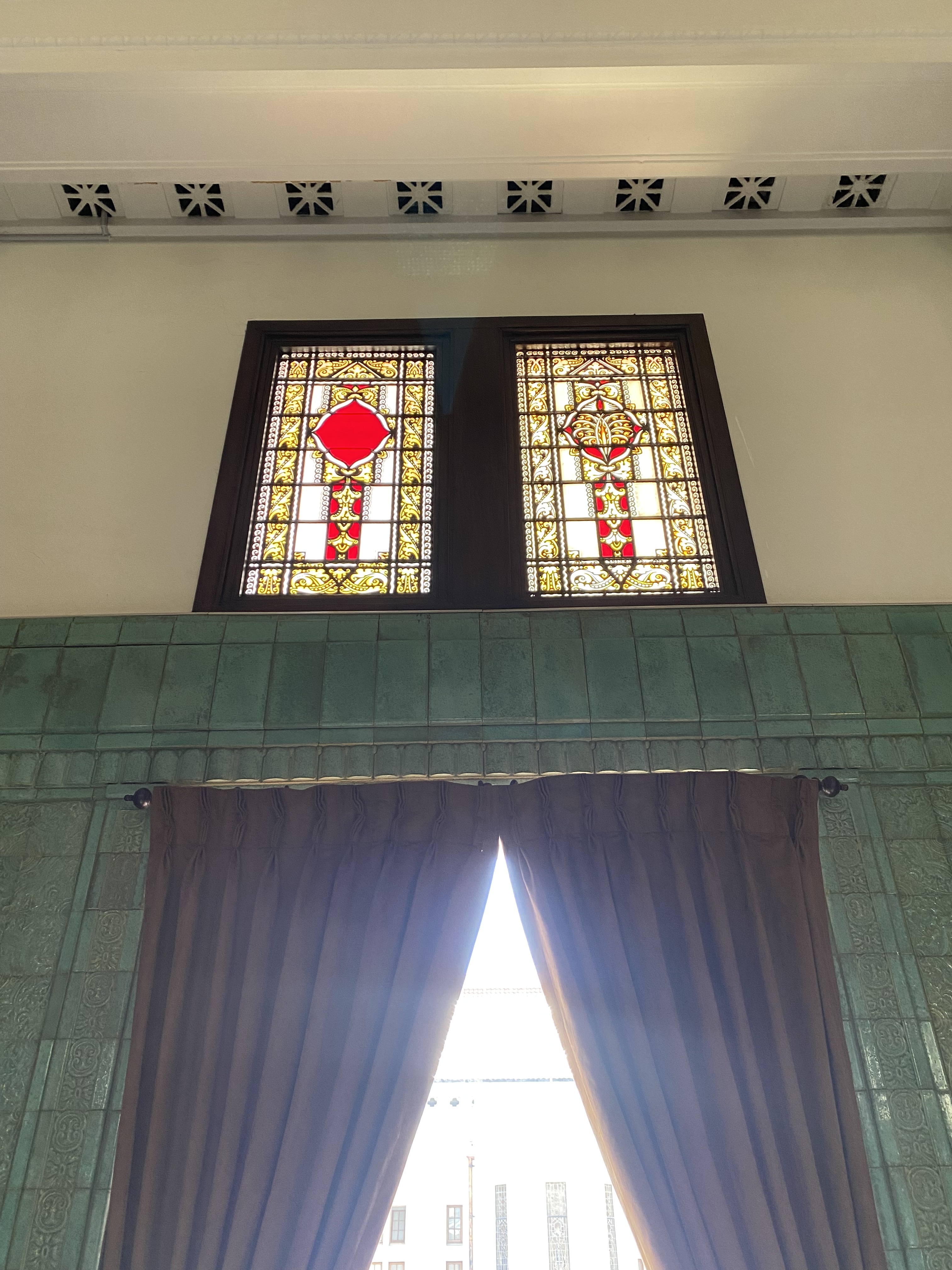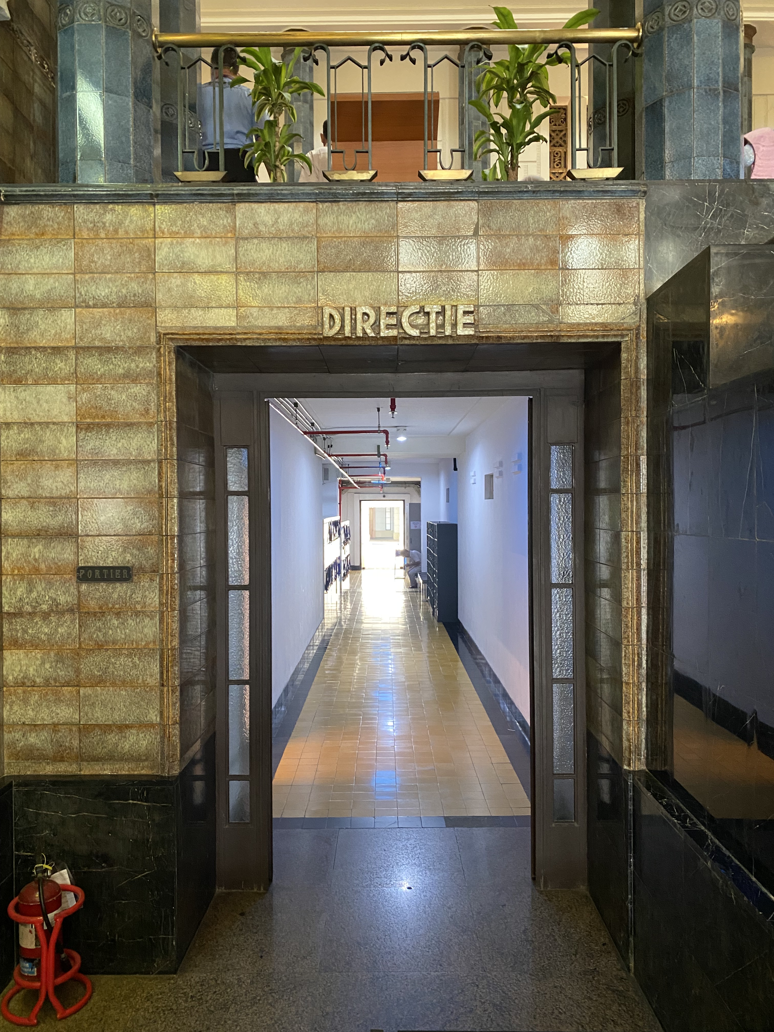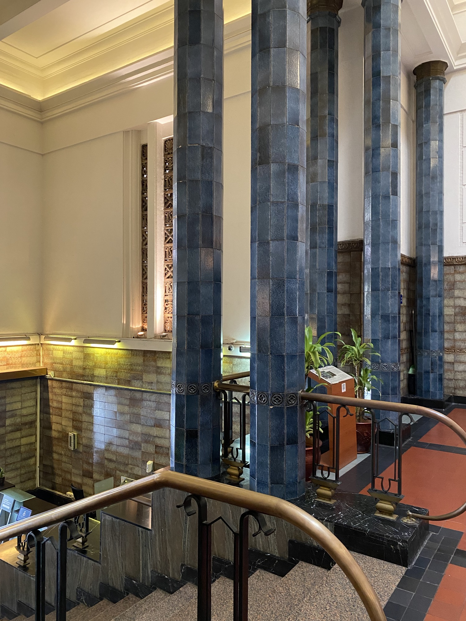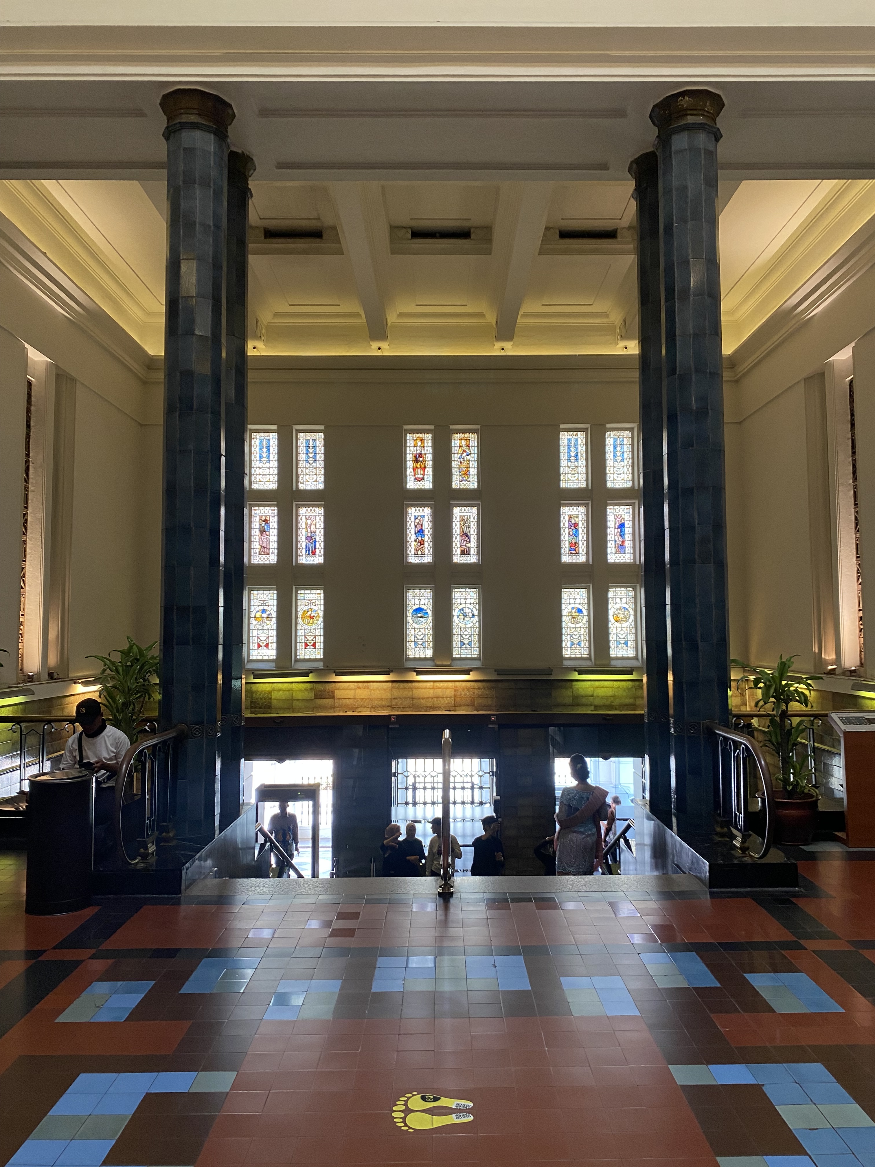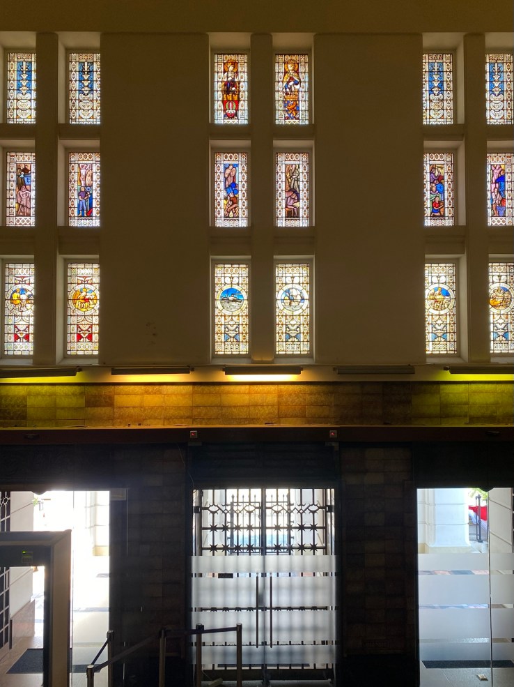 Bagian lobby, terletak di tengah bangunan, ketika memasuki bangunan ini akan disambut tangga dengan railing besi dan pilar keramik glasur, indah sekali, dan ketika kita menengok ke belakang akan terlihat deretan kaca patri indah, menurut catatan di MuBI, ada sekitar 314 kaca patri di gedung ini dan semua dibuat di atelier Jan Schouten, Delft, Negeri Belanda pada 1922 – 1935, permukaan kaca dibuat tidak teratur, untuk membiaskan warna terutama ketika cahaya matahari menerpa bagian gedung.