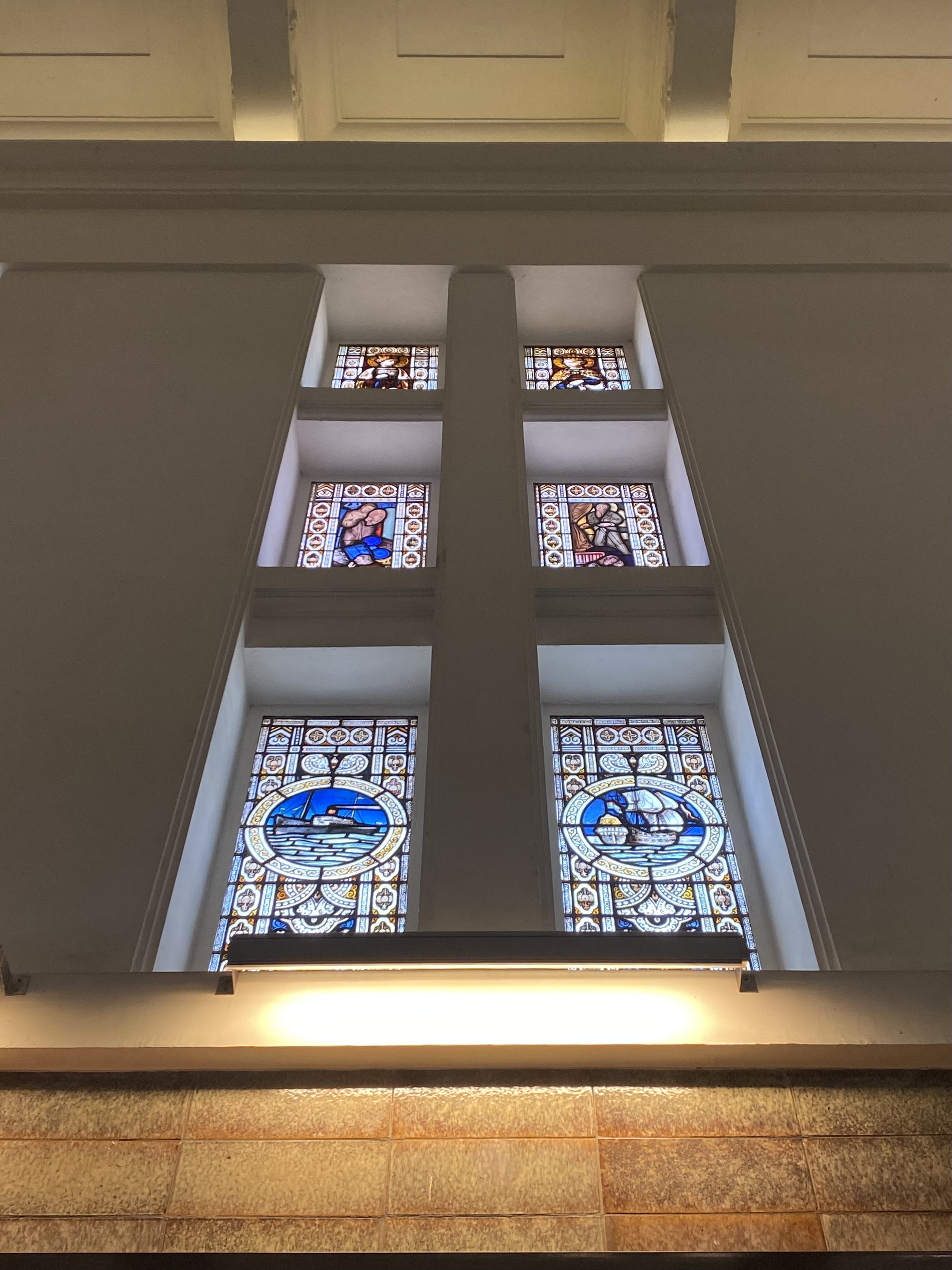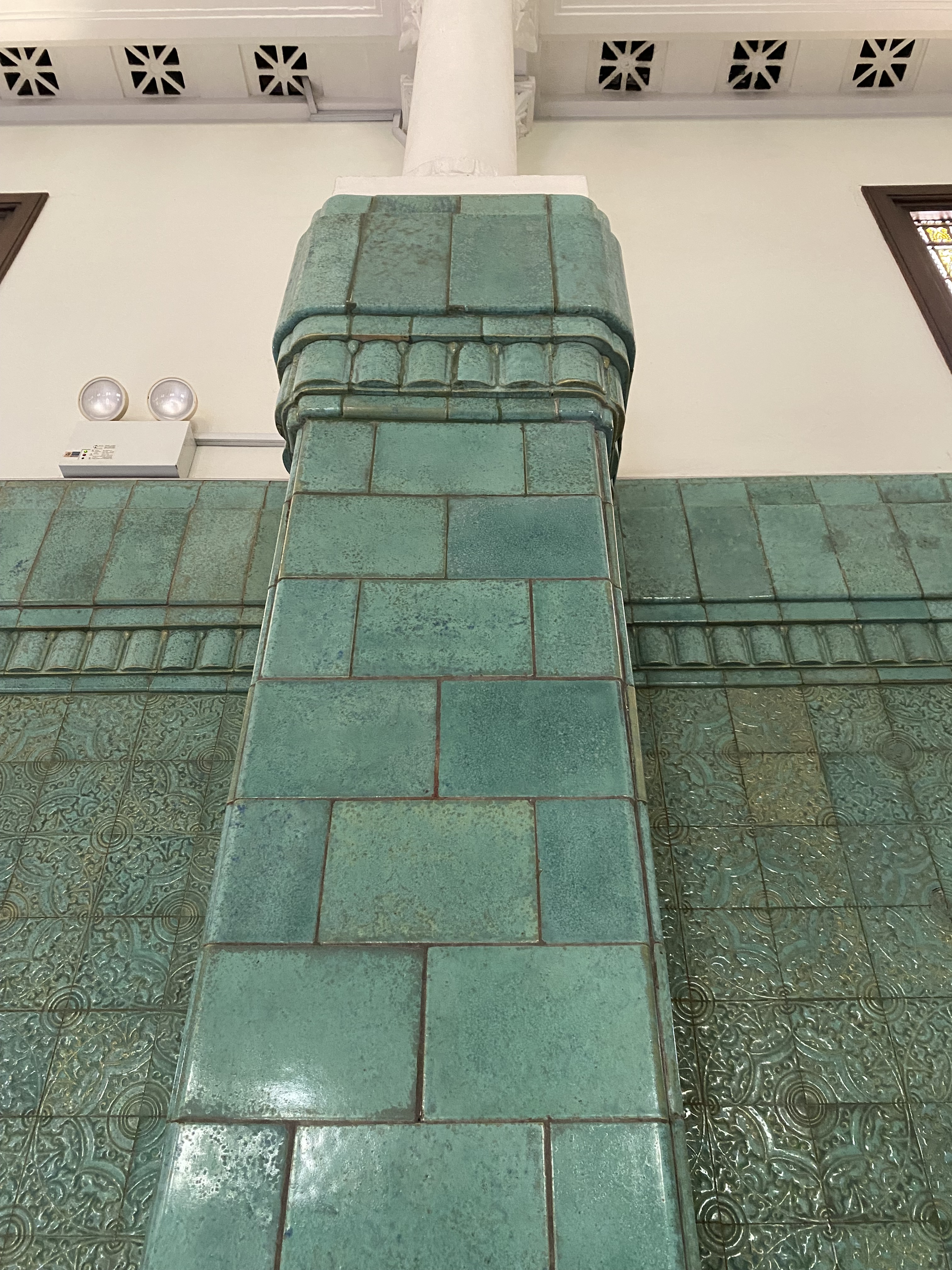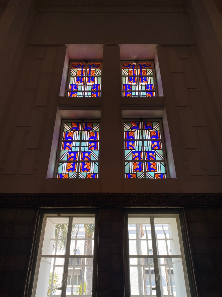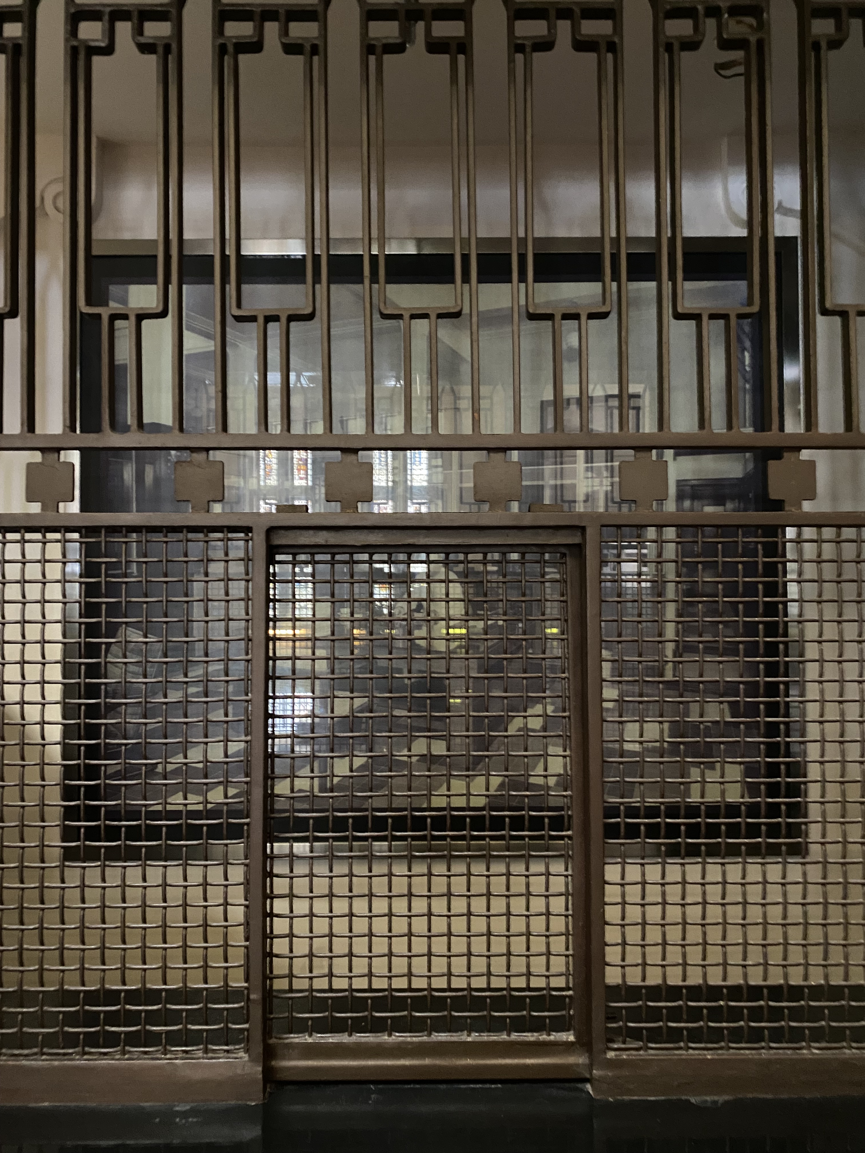 Bagian lobby, terletak di tengah bangunan, ketika memasuki bangunan ini akan disambut tangga dengan railing besi dan pilar keramik glasur, indah sekali, dan ketika kita menengok ke belakang akan terlihat deretan kaca patri indah, menurut catatan di MuBI, ada sekitar 314 kaca patri di gedung ini dan semua dibuat di atelier Jan Schouten, Delft, Negeri Belanda pada 1922 – 1935, permukaan kaca dibuat tidak teratur, untuk membiaskan warna terutama ketika cahaya matahari menerpa bagian gedung.