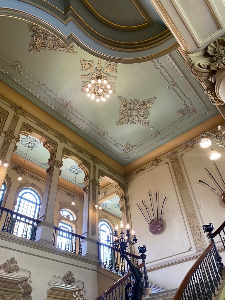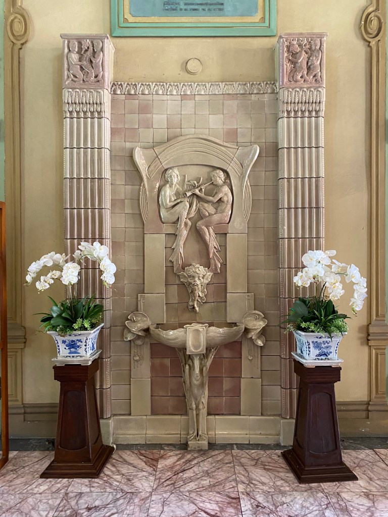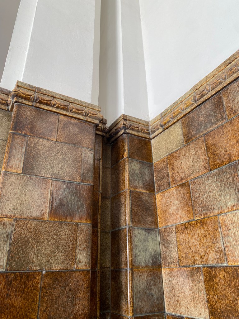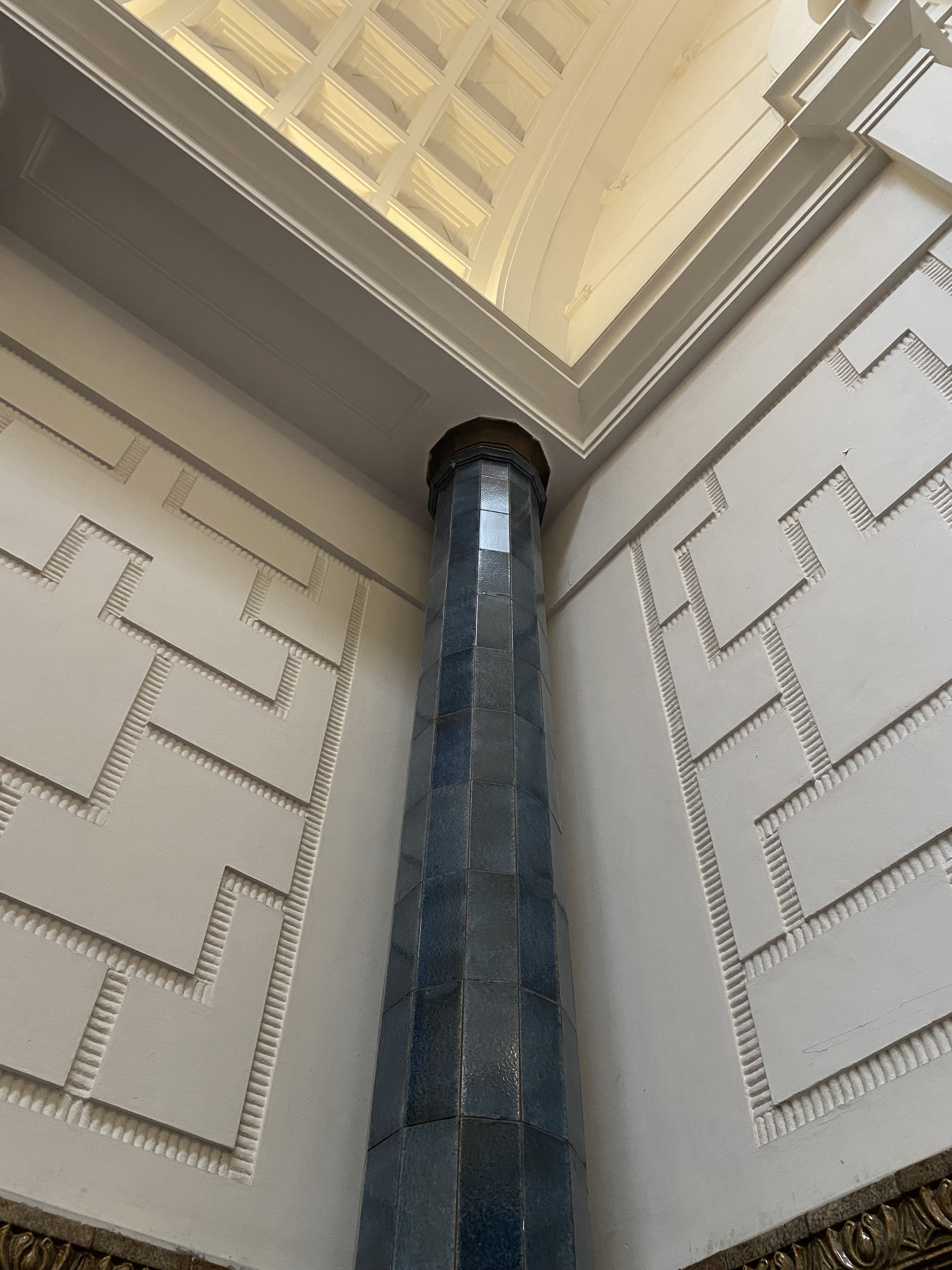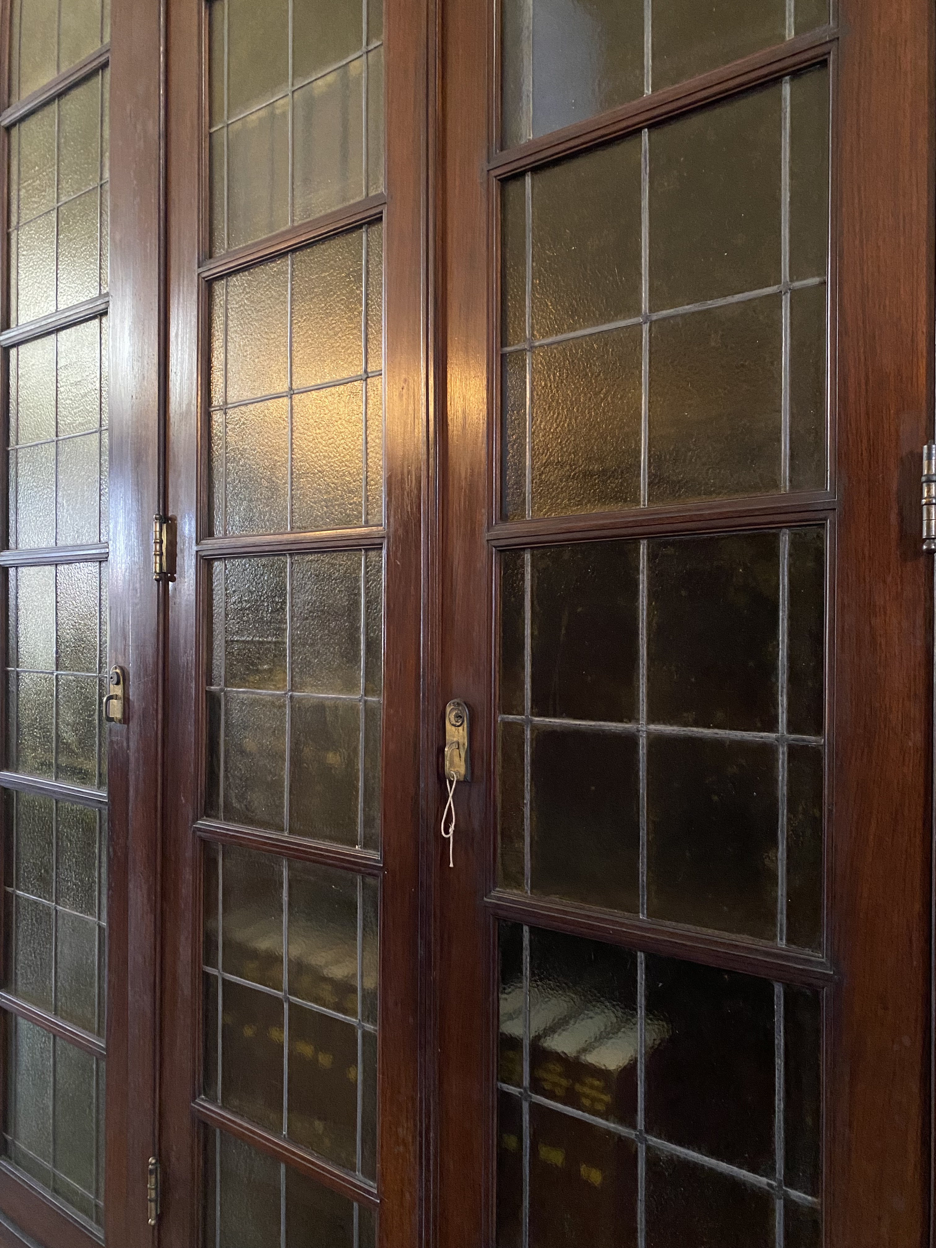 Bagian lobby, terletak di tengah bangunan, ketika memasuki bangunan ini akan disambut tangga dengan railing besi dan pilar keramik glasur, indah sekali, dan ketika kita menengok ke belakang akan terlihat deretan kaca patri indah, menurut catatan di MuBI, ada sekitar 314 kaca patri di gedung ini dan semua dibuat di atelier Jan Schouten, Delft, Negeri Belanda pada 1922 – 1935, permukaan kaca dibuat tidak teratur, untuk membiaskan warna terutama ketika cahaya matahari menerpa bagian gedung.