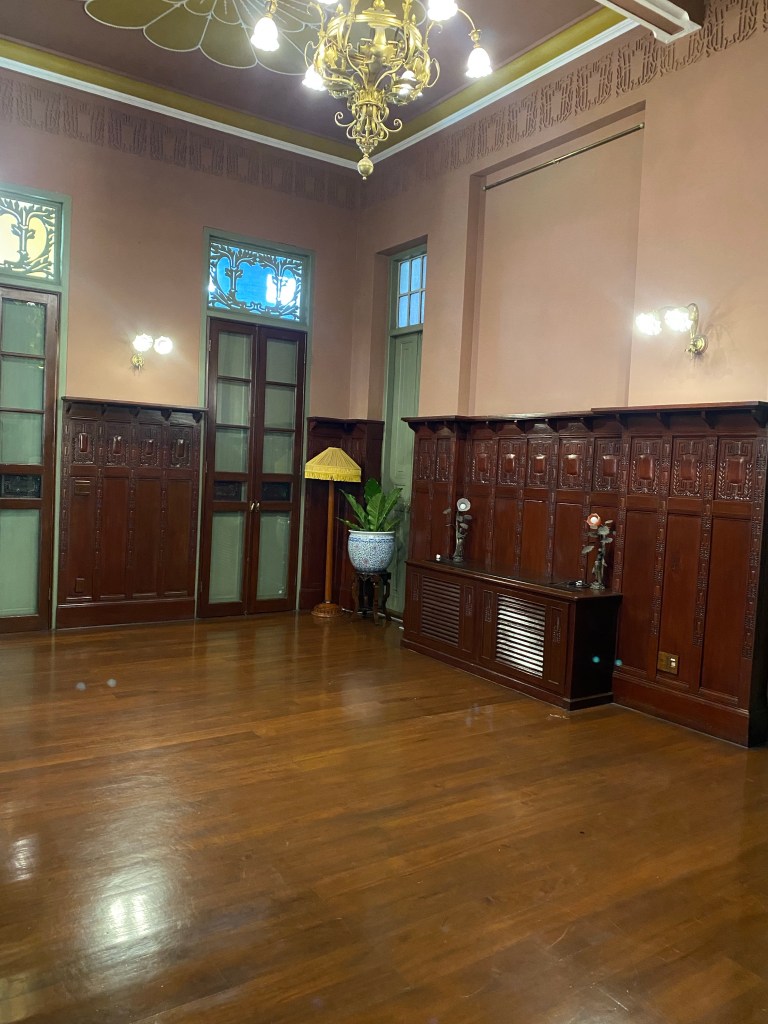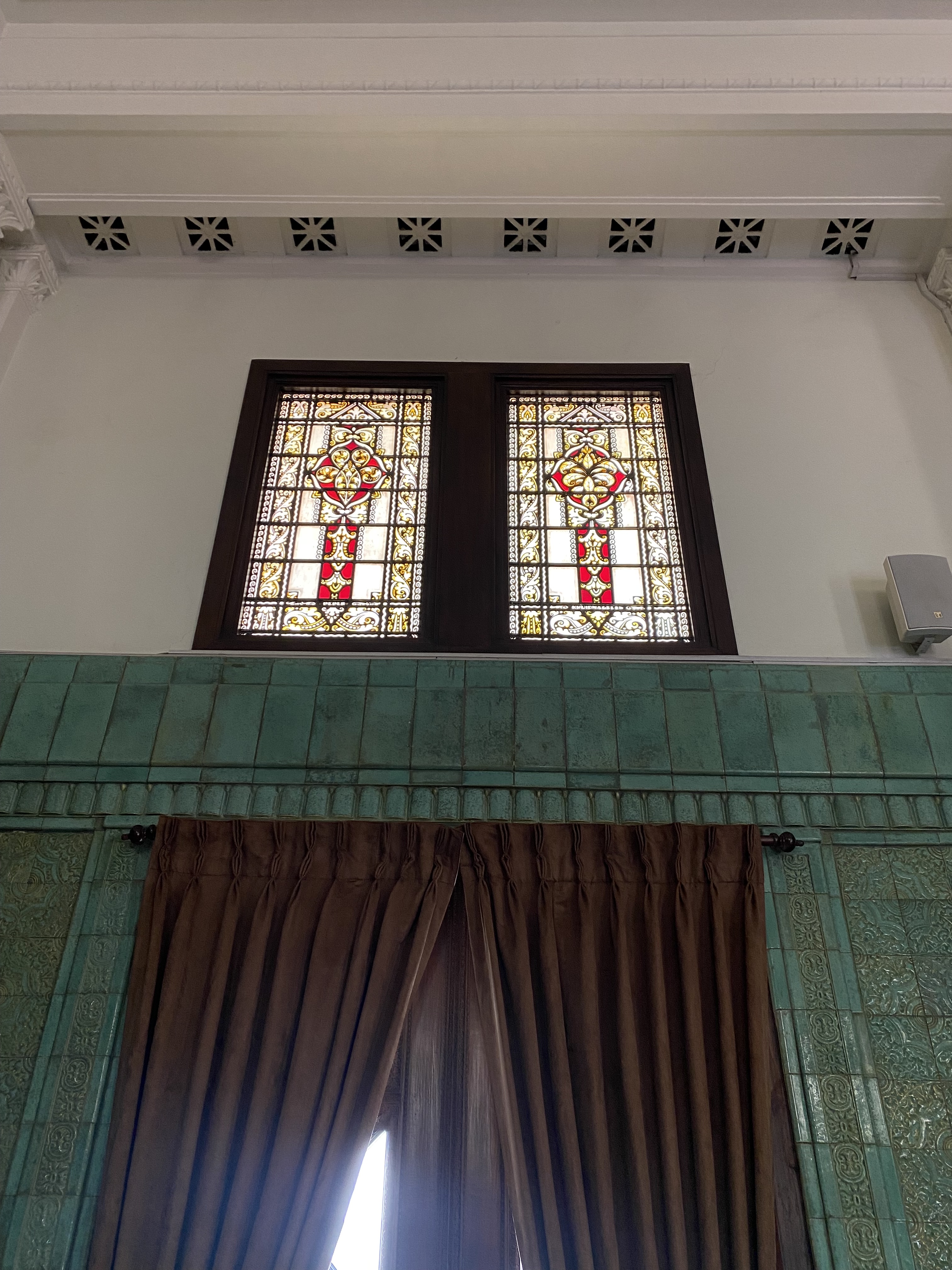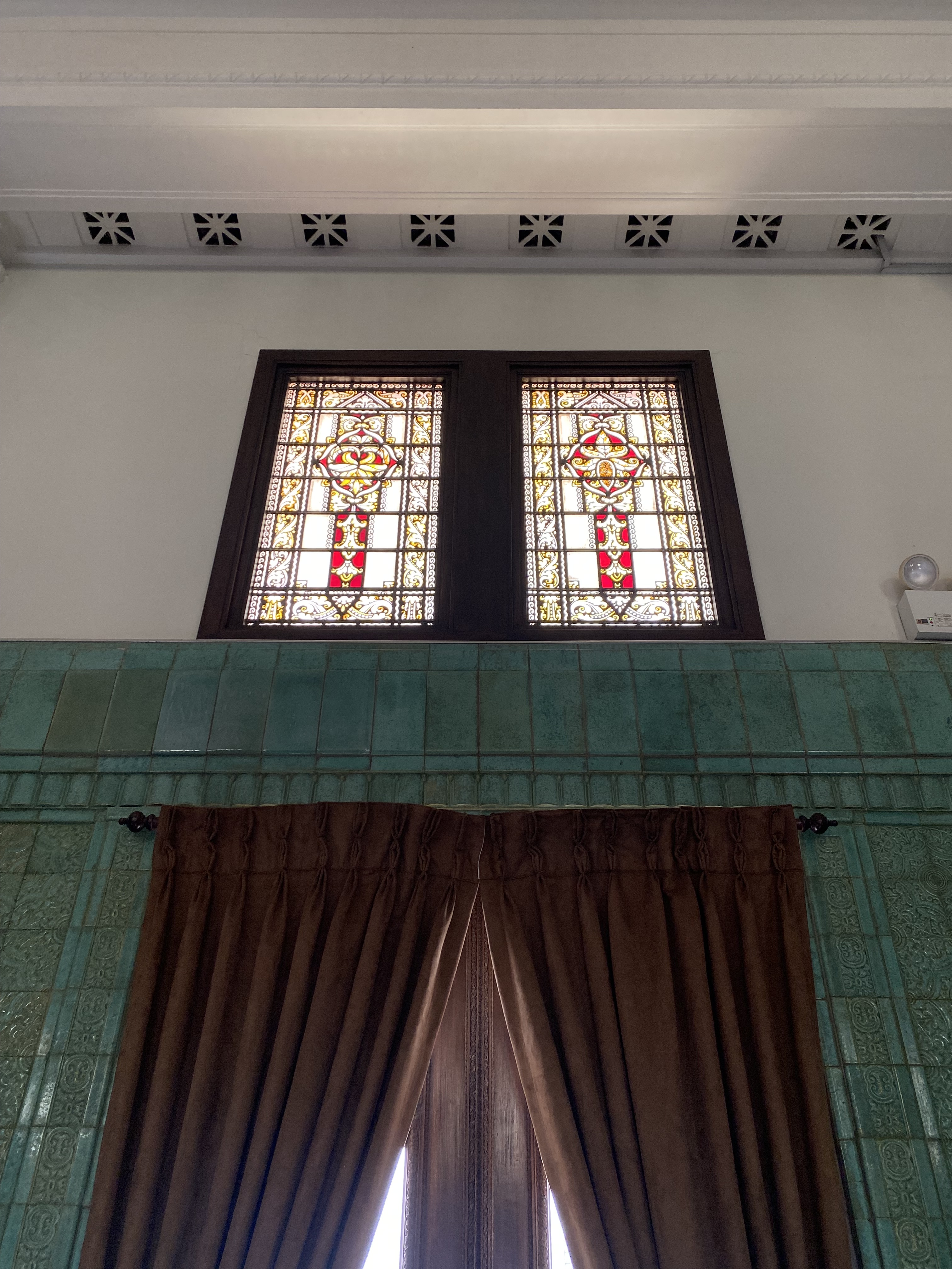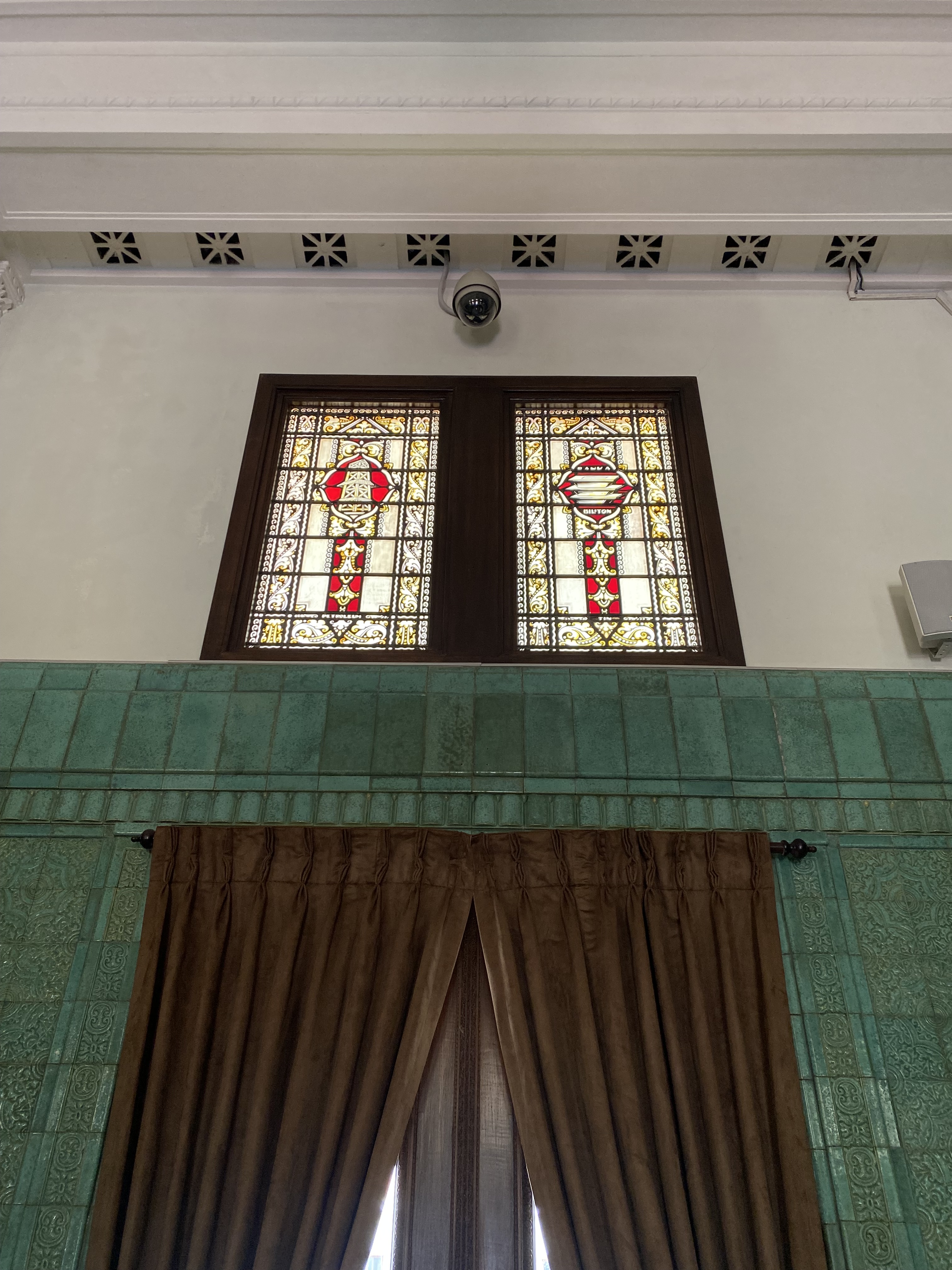 Satu bangunan yang besar dan indah adalah Green Room, yang pada awalnya merupakan bagian dari Binnenhospitaal ketika pertama kali De Javasche Bank menempati gedung ini, dan sejak dahulu memang gedung ini menjadi ruang rapat direksi, perhatikan sebuah built-in jam di dinding dibagian tengah, indah sekali, tertanda tahuan 1828 – 1928 peringatan 80 tahun De Javasche Bank, mengapa hijau dan mengapa keramik? Semua ini menjadi masuk diakal ketika membaca keterangan di dalam ruangan ini, green color gave those soothing effects, dan tentu keramik berglasur ini memiliki efek pendingin ruangan selain atap yang tinggi dan bovenlicht/ventilasi udara dengan ornamen kaca patri, coba sentuh dinding ruangan ini, adem! Renovasi ruangan ini dilakukan pada tahap kedua di tahun 1922, dan berdasar catatan dahulu di ruangan ini terdapat lukisan besar Ratu Wilhelmina dan Presiden Direktur De Javasche Bank yang sedang menjabat.