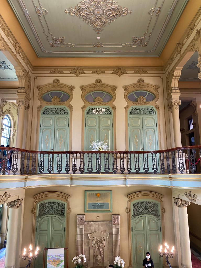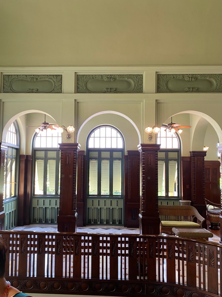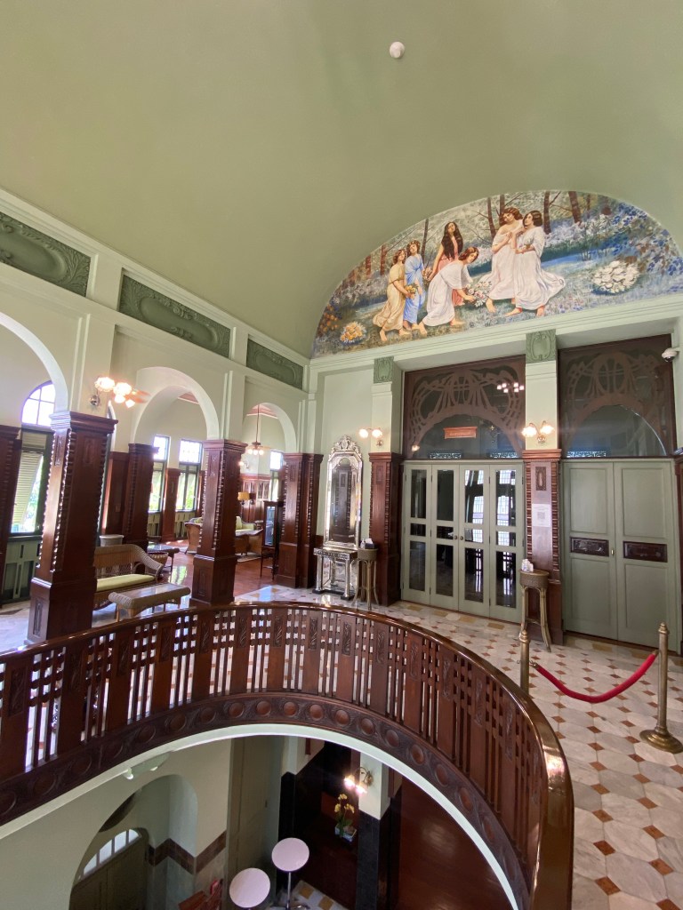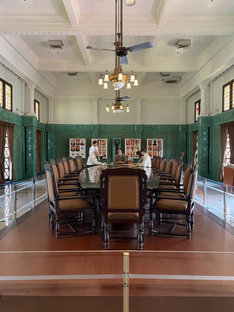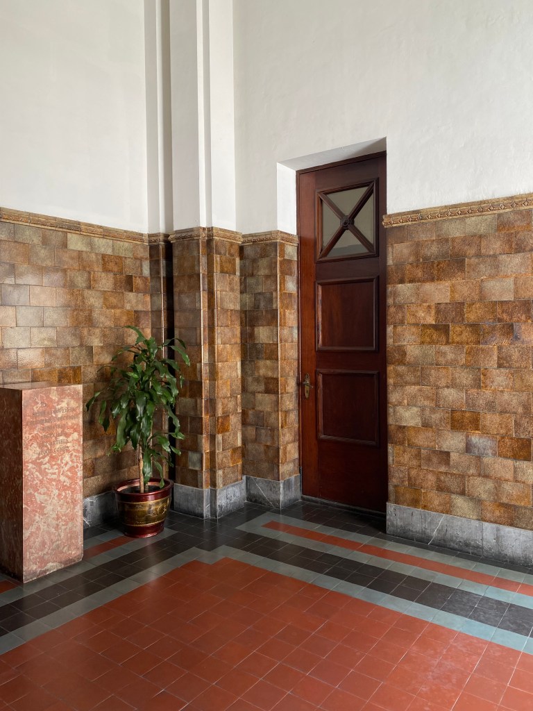 Satu bangunan yang besar dan indah adalah Green Room, yang pada awalnya merupakan bagian dari Binnenhospitaal ketika pertama kali De Javasche Bank menempati gedung ini, dan sejak dahulu memang gedung ini menjadi ruang rapat direksi, perhatikan sebuah built-in jam di dinding dibagian tengah, indah sekali, tertanda tahuan 1828 – 1928 peringatan 80 tahun De Javasche Bank, mengapa hijau dan mengapa keramik? Semua ini menjadi masuk diakal ketika membaca keterangan di dalam ruangan ini, green color gave those soothing effects, dan tentu keramik berglasur ini memiliki efek pendingin ruangan selain atap yang tinggi dan bovenlicht/ventilasi udara dengan ornamen kaca patri, coba sentuh dinding ruangan ini, adem! Renovasi ruangan ini dilakukan pada tahap kedua di tahun 1922, dan berdasar catatan dahulu di ruangan ini terdapat lukisan besar Ratu Wilhelmina dan Presiden Direktur De Javasche Bank yang sedang menjabat.