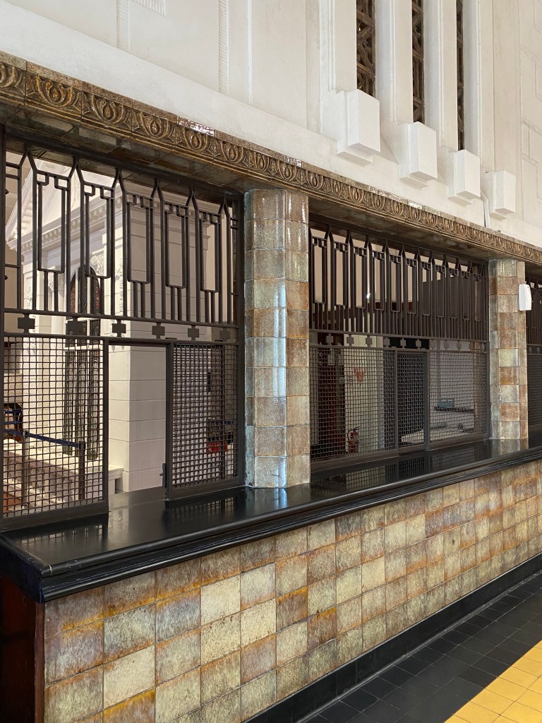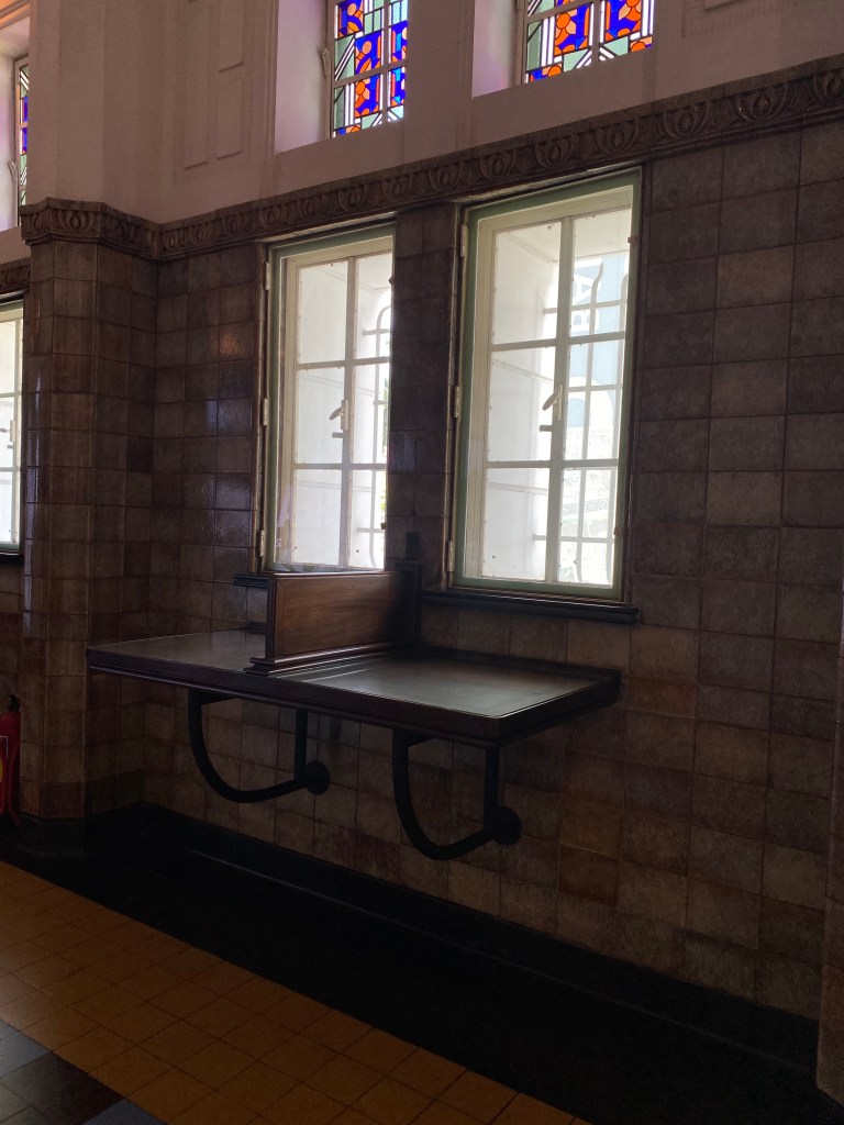 Ruangan pertama yang akan dimasuki pengunjung adalah area yang pada masa lalu merupakan area teller, terdapat ruangan-ruangan kecil berjeruji untuk keperluan penyetoran para nasabah, tempat duduk built-in menarik buat diperhatikan termasuk meja yang menempel di dinding, juga ornamen kaca patri pola kotak sederhana tapi kaya akan warna!