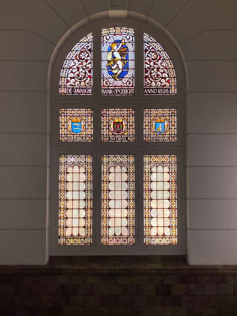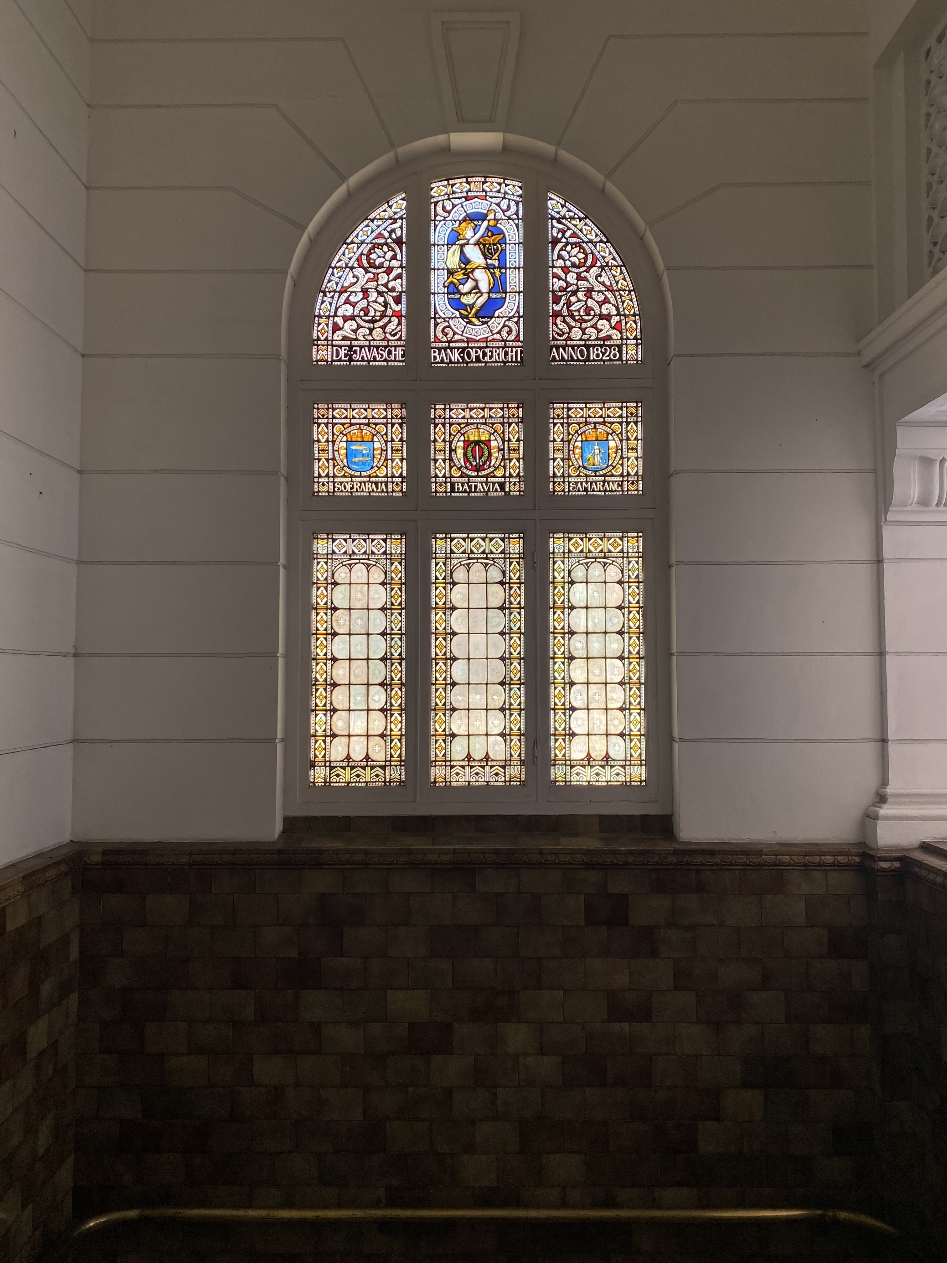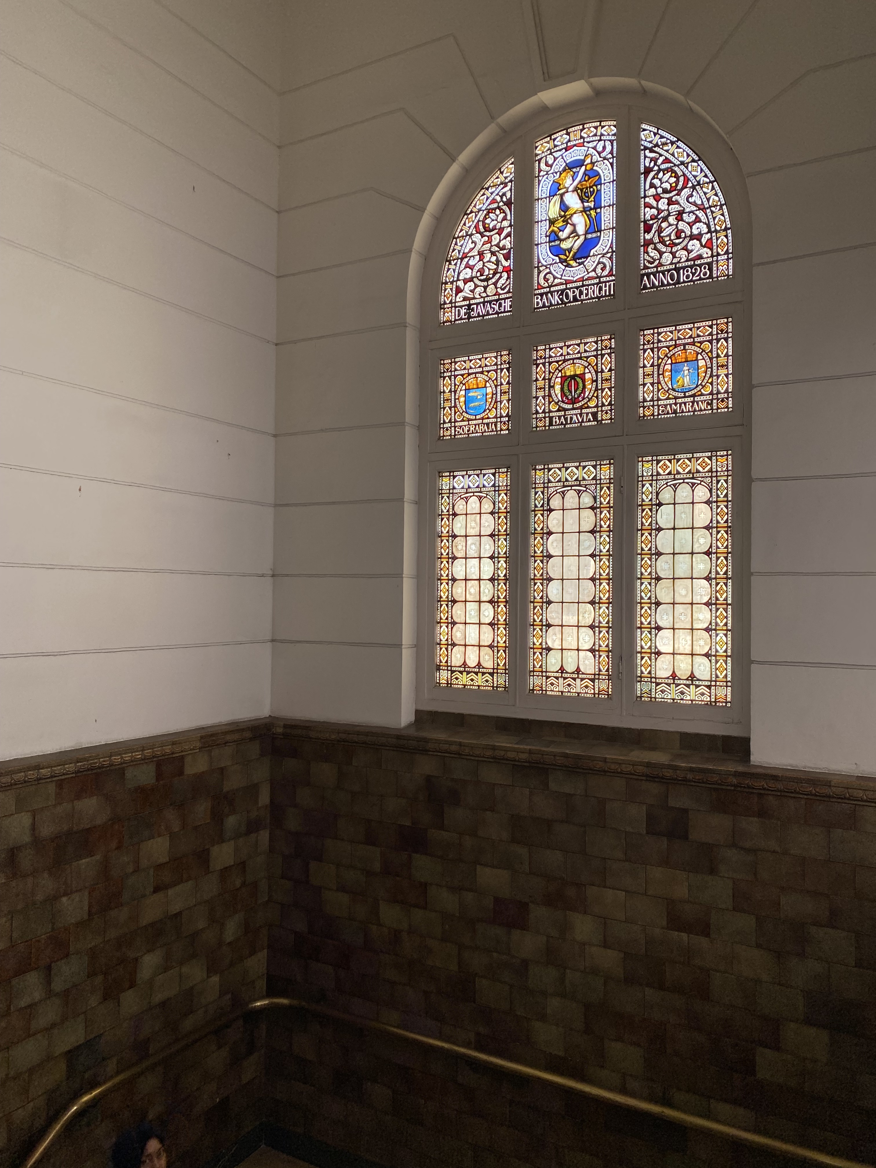 Jendela dengankaca patri lain adalah di salah satu sayap bangunan tepatnya di tangga penghubung dari lantai satu ke lantai 2, terdapat kaca patri Dewa Hermes dibagian tengah atas dan dibagian bawah terdapat keterangan berdirinya De Javasche Bank – De Javasche Bank Opgericht Anno 1828, kemudian terdapat 3 lambang kota dimana De Javasche Bank ini berdiri – SOERABAJA (Surabaya) – BATAVIA – SAMARANG (Semarang), indah sekali.