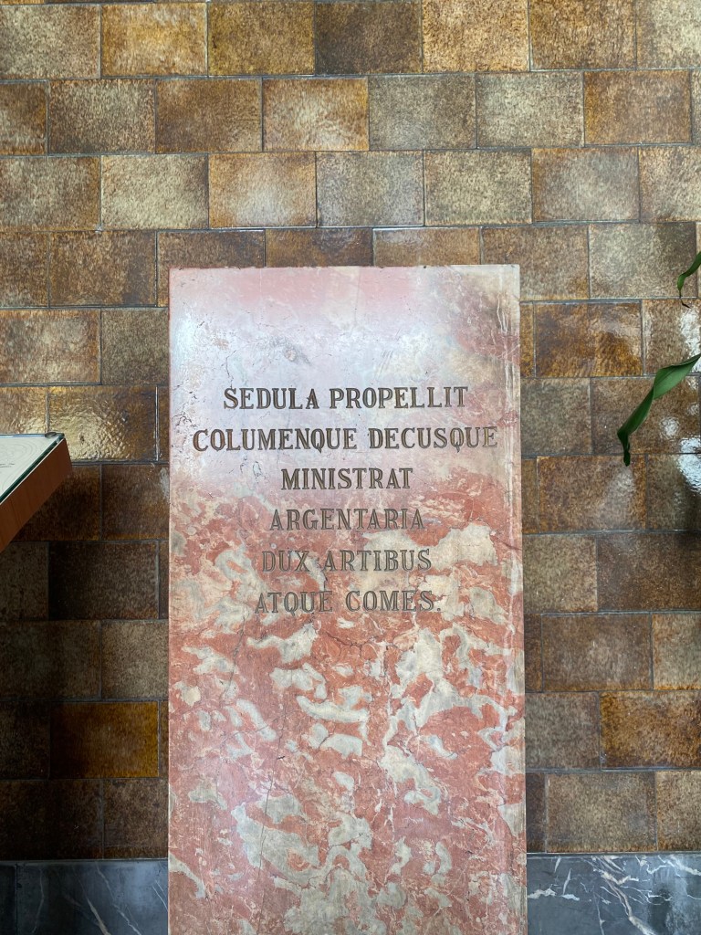 Nah tepat di sebrang kaca patri ini (perhatikan) ada sebuah tugu terbuat dari batu marmer bertuliskan bahasa latin – SEDULA PROPELLIT COLUMENQUE DECUSQUE MINISTRAT ARGENTARIA DUX ARTIBUS ATQUE COMES – artinya : “Bank yang aktif mendirikan tiang-tiang dan menjunjung seni hiasmenjadi pelopor pendukung kesenian”, totem berbahan marmer merah mudah ini menandakan penghargaan kepada De Javasche Bank yang sudah bisa menghadirkan identias sebuah lembaga perbankan dengan indah, totem ini didirikan pada 1922, di masa renovasi kedua bagi gedung ini.